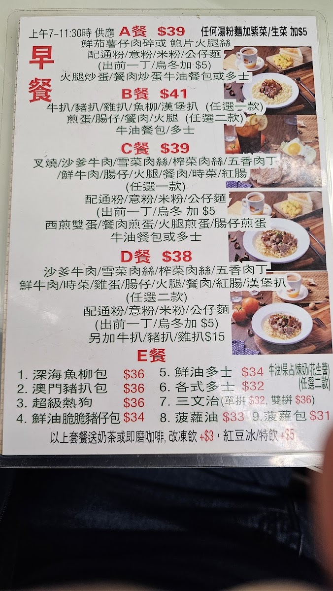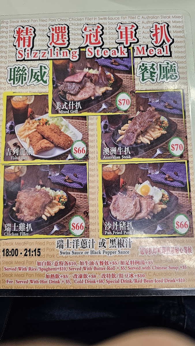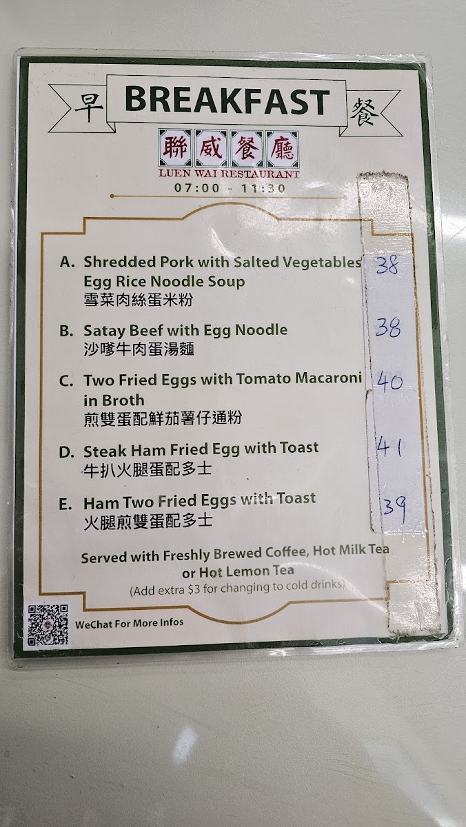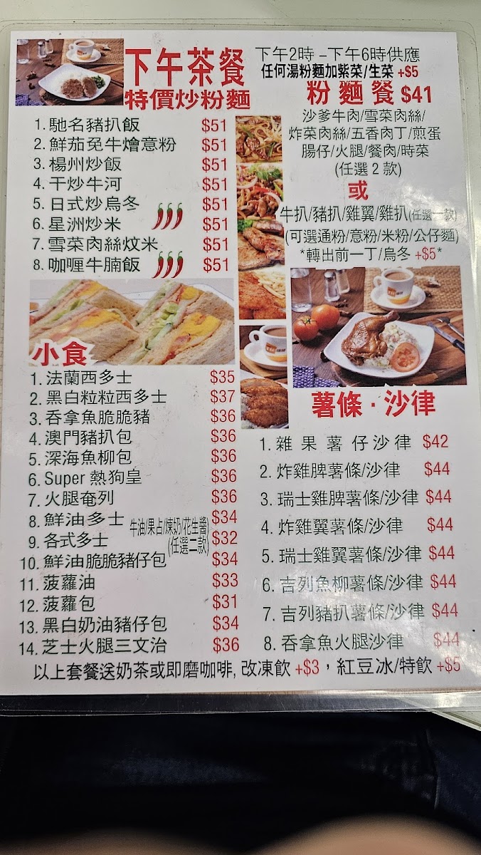 The menu at Lun Wai Restaurant (15B Austin Ave, Tsim Sha Tsui) feels like a compact “greatest hits” of comforting, no-fuss café staples, mixing Western-style breakfast items with hearty Cantonese rice and noodle plates. For a simple morning set, With Ham Omlet and Butter Roll pairs classic flavors with an easy, filling carb-and-protein balance, while lighter bites like Tuna Bun and 토스트 keep things quick and approachable. If you want something more substantial, rice bowls such as 涼瓜牛肉飯 奶茶 and 窩蛋免治牛飯 lean into that satisfying home-style vibe-savory beef, rice, and a drink option that completes the meal without overcomplicating it. Daily comforts also show up in 例湯 Soup of the Day, which rounds out an order nicely, alongside straightforward drinks like 熱咖啡 and milk tea. For those who prefer bolder stir-fry flavors, dishes like 豉椒魷魚炒麵 bring a punchy, wok-driven profile, while 沙嗲牛肉麵 delivers a richer, fragrant satay taste that’s reliably crowd-pleasing. On the classic Cantonese side, 咸鱼肉餅飯 is the kind of salty, deeply savory option that feels made for rice, and 招牌小炒皇 adds variety and texture with a signature mixed stir-fry approach. If you’re after a “big plate” experience, 雜排餐 offers that mixed-grill satisfaction, while chicken and pork rice mains like 黃袍雞脾飯 and 招焗猪扒飯牌 keep the menu grounded in filling, everyday favorites. Even details like 早餐茄通 37 reinforce the sense that this is a place built around practical value and familiar flavors-ideal when you want a dependable meal that’s fast, hearty, and clearly centered on these standout staples.